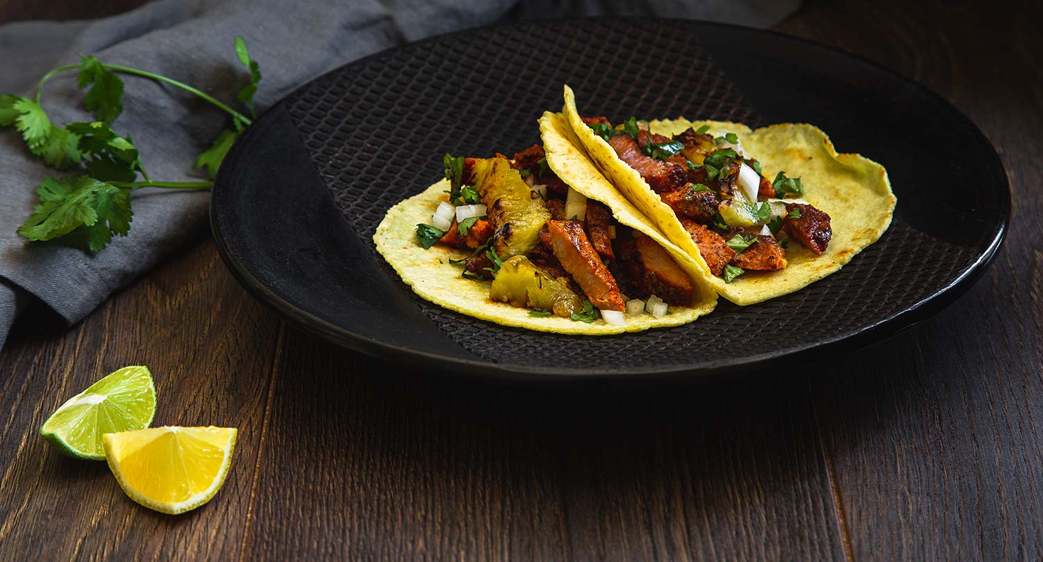 6. Calienta las tortillas y rellénalas con la carne. Agrega piña, cebolla, cilantro, salsa y unas gotitas de limón.